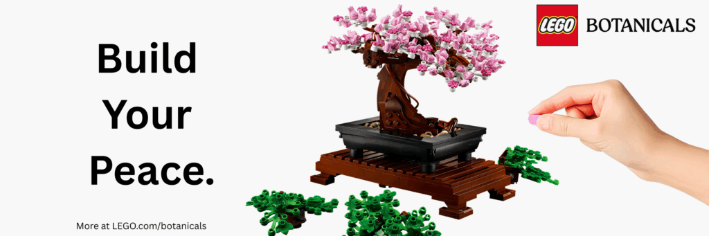 Design Rationale: This visual uses a pure white background and bold, minimal typography to create calm and focus. The hand placing a pink LEGO blossom emphasizes mindfulness and personal connection, while the classic Bonsai Tree set grounds the scene in a familiar, iconic form. Simplicity, symmetry, and softness guide the composition—letting the message “Build Your Peace” speak loud and clear.