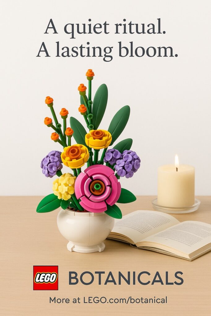 Design Rationale: This ad pairs warm lighting and soft neutral tones to evoke a sense of calm and introspection. The LEGO Floral Bouquet sits alongside an open book and candle—symbolizing mindful rituals and cozy solo moments. Large serif text and a clean background keep the focus on emotional simplicity, letting the tagline “A quiet ritual. A lasting bloom.” resonate with the viewer’s desire for peace and permanence.