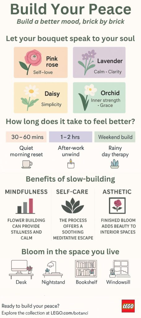 Design Rationale: This infographic serves as both a gentle introduction to the LEGO Botanical Collection and a lifestyle guide for emotional well-being through creative play. Designed with a soft color palette and intuitive layout, it presents key flower meanings, build time suggestions, and mindfulness benefits in a way that’s both informative and soothing. The visual tone mimics a self-care journal—inviting, clear, and emotionally aware. It encourages viewers to see each build not just as a product, but as a personal ritual to fit into their day, their mood, and their space.